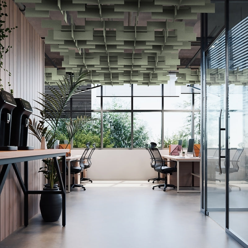 Weave de Lumii de la série StratoScape est un élégant plafond acoustique qui allie harmonieusement esthétique et fonctionnalité acoustique. Fabriqué à partir de feutre Miixfelt respectueux de l'environnement, il offre une absorption sonore supérieure et réduit la réverbération, vous permettant de rester concentré sur vos tâches.