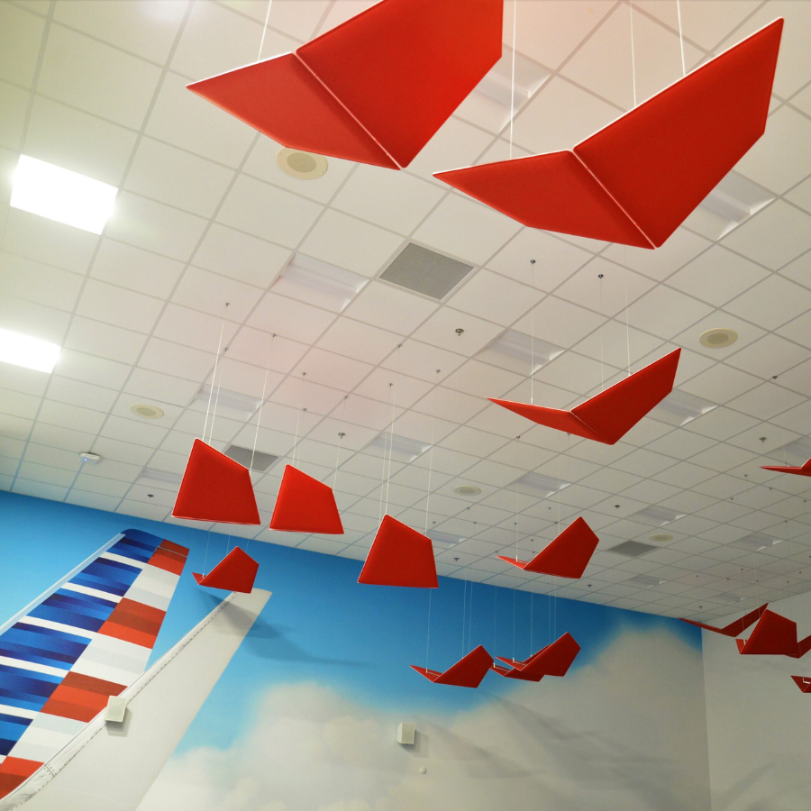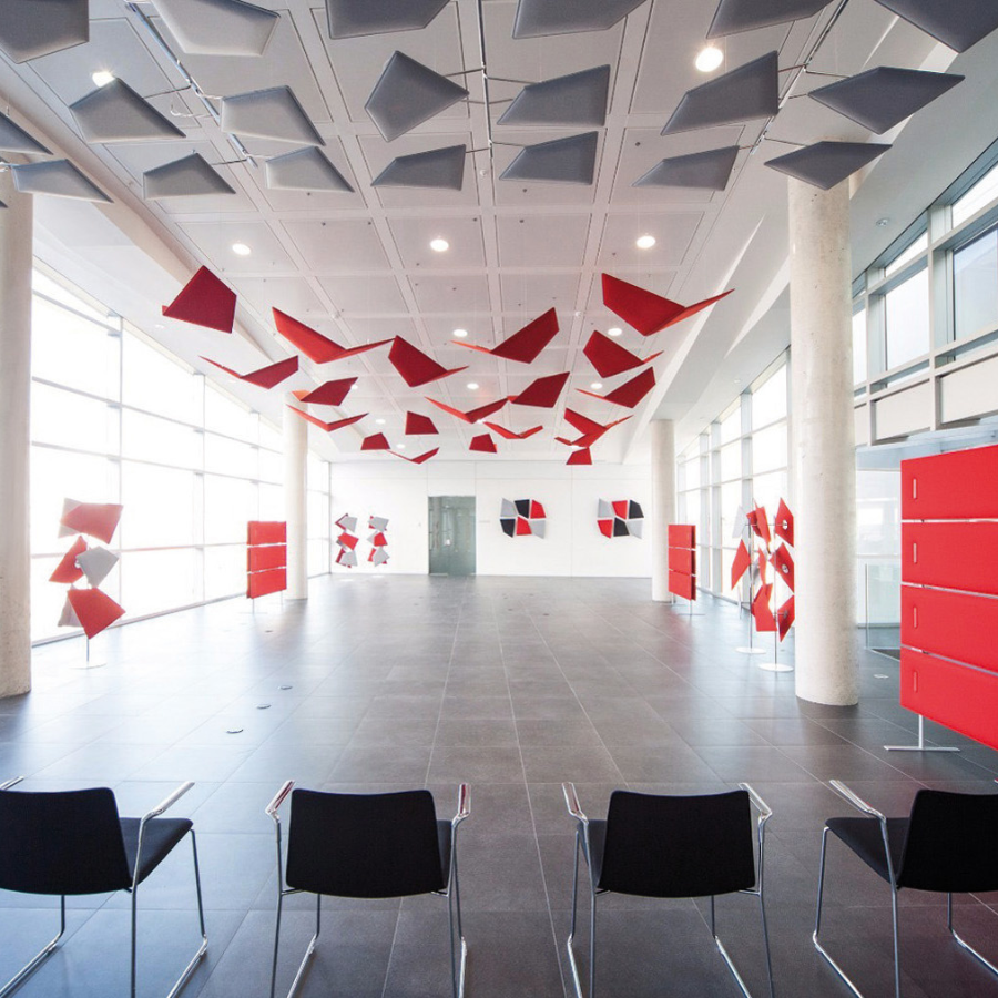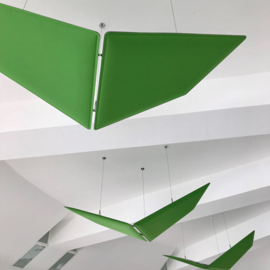 Combining two Snowsound Flaps to emulate a pair of wings, each Flap is built with a polyester internal padding with a polyester covering in Trevira CS® fabric. These panels are equipped with a chrome-plated steel frame, aircraft cables, and ceiling plates, allowing for easy ceiling installation.
