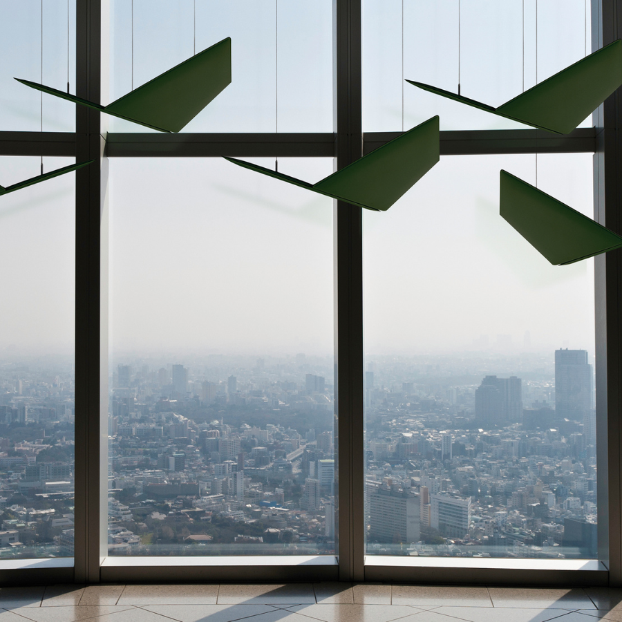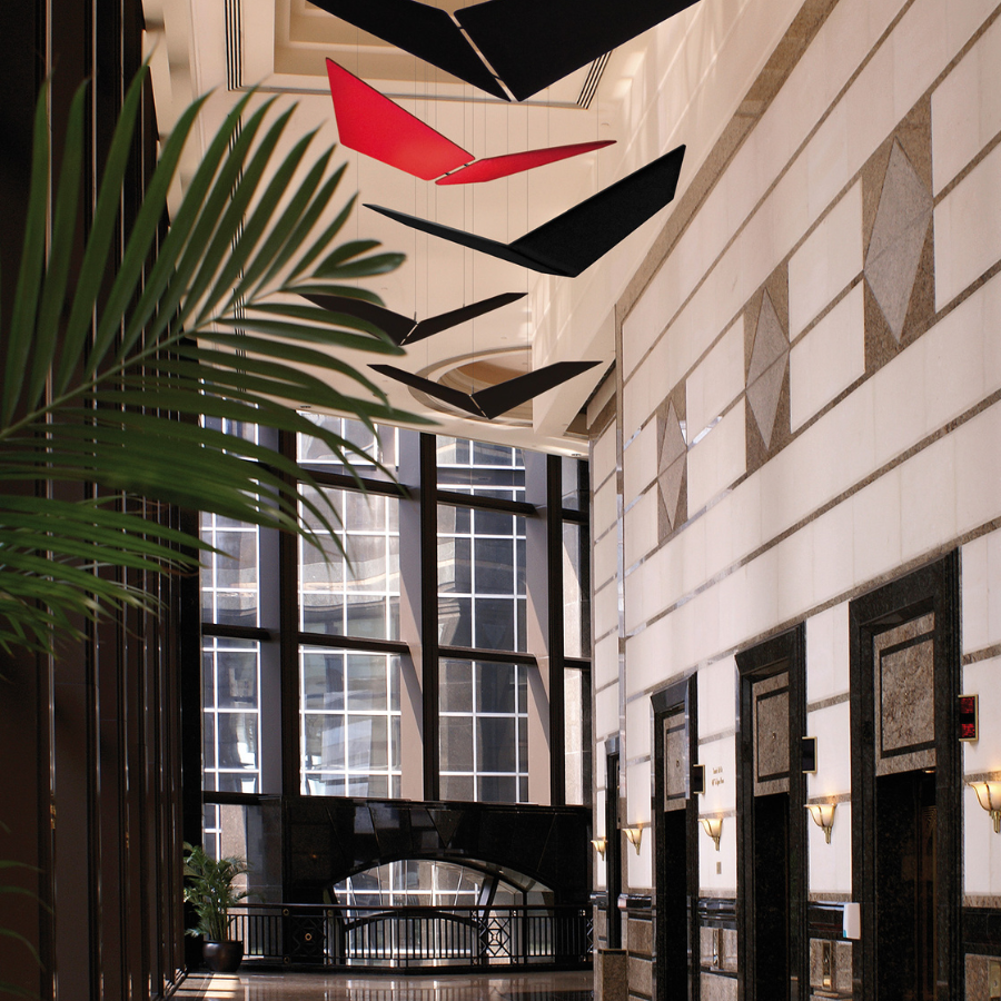 With a suspended, chrome-plated steel frame, the Snowsound Flap Wings are designed to absorb sound waves with a strong visual component, evoking the image of a pair of wings flying in the sky.