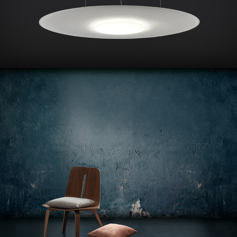 A hybrid solution combining complementary indoor lighting with acoustic support, the Snowsound Giotto Lux is a circular, sound-absorbing panel suspended from the ceiling. It features a central light fixture crafted from enamelled metal and illuminated via an LED light source. Protected by a frosted white polyethylene shade, the LED light produces uniform light distribution, offering comfortable and functional lighting in any given space.